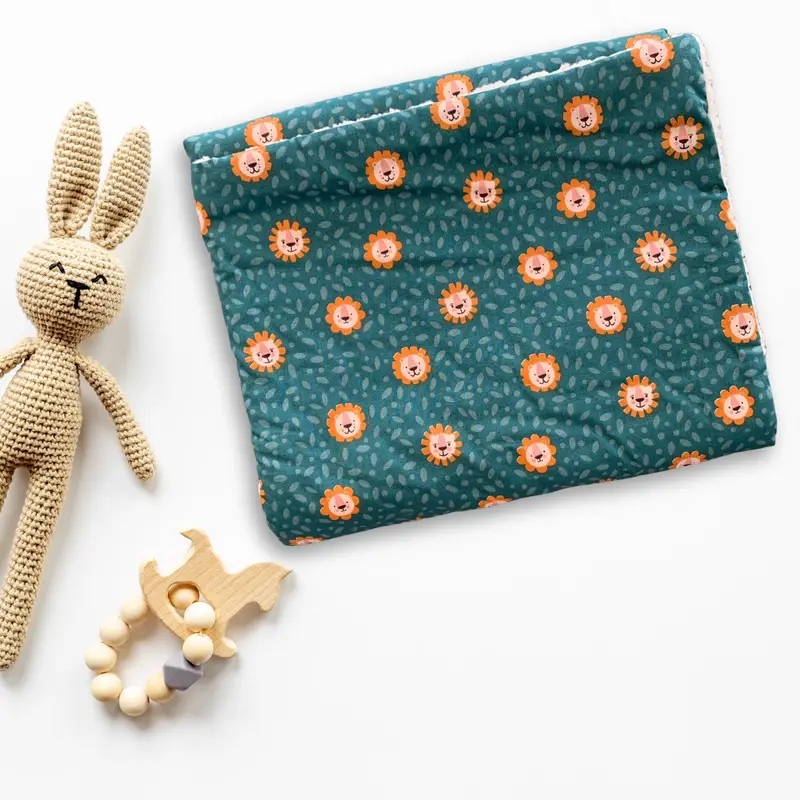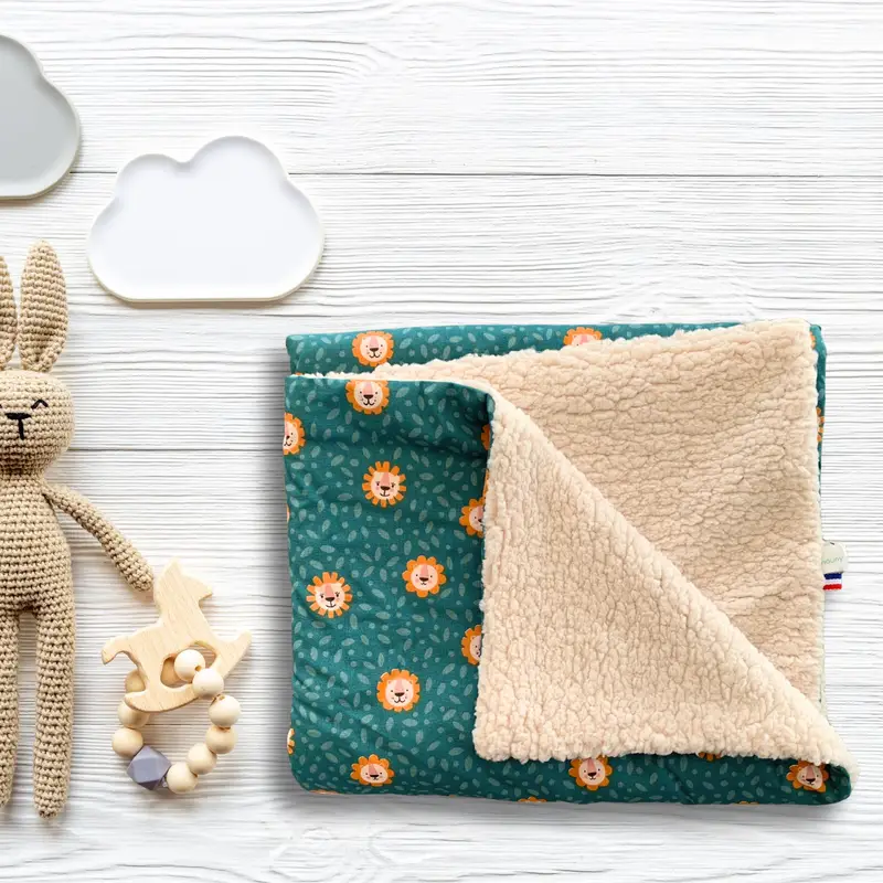 Plongez dans un univers tendre et sauvage avec cette magnifique couverture bébé en Sherpa au motif têtes de lions sur fond vert. Douce, chaude et moelleuse, elle enveloppe bébé dans un véritable cocon de confort.
